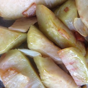 There are innumerable ways to cook this fruit. I’ve only explored a little bit in this area, but so far my favorite method is to cut the fruit in half, peel off the skin with a vegetable peeler, cut out the inedible central core, and cut up the surrounding starchy flesh into chunks. Then I pan-fry those chunks with sliced onion in a bit of coconut oil. It’s really, really good – a little bit like eating a potato, but with distinctive hearty texture and delicious flavor unlike any potato I’ve ever eaten.