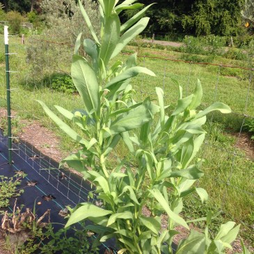 At some point during its growth process, the plant starts to branch out and produce leaves that are progressively smaller and smaller, but still good to harvest. Eventually the plant can get up to six feet (two meters) of total height, although at that point it often has flopped over on its side, and the growing tip has turned upward. At around six feet of stalk height the plant starts to flower, with small, whitish-yellow blooms, and then makes tiny, black seeds.