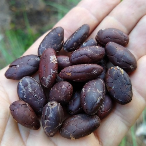 These seeds are very close to the flavor of commercial cacao nibs, with a slightly softer texture and maybe a few hints of nutty flavor I don’t find in the commercial nibs. With both forms of cacao, my own cacao beans and store-bought nibs, I like to eat them either on their own, or mixed with a few nuts (almond or pecan), and some raisins. Short of eating the fresh whole cacao fruit, eating cacao beans combined with nuts and dried fruit is really all the chocolate I could ever need or want.