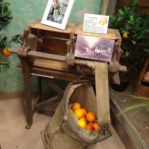 The museum has several old-time wooden citrus crates. The display also features an original “crate jig” for assembling these wooden boxes – the crates were delivered to the citrus packing houses in flattened form, and workers used the crate jig to assemble the crates into three dimensional shape.