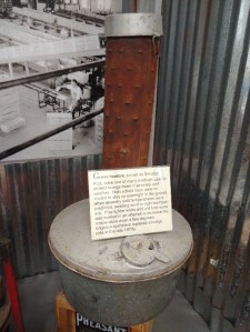 To protect their citrus trees from occasional winter freezes, growers used oil-burning grove heaters, also called smudge pots, metal devices placed out in the groves in winter. On sub-freezing nights, they would light fires in these heaters and keep the fires going all night to hopefully radiate out enough heat to protect the neighboring trees. Additionally, all those grove heaters would produce a cloud of smoke hanging over the groves that would help block loss of heat through radiational cooling to the sky. The display features a couple of different styles of smudge pots.