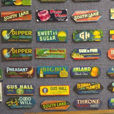 To aid in marketing their fruit in these wholesale markets, and to achieve name recognition for their particular brand, citrus growers placed colorful labels on the ends of the crates. Hundreds of growers had artists design their own distinctive brand labels, and walls of the citrus room at the museum are covered with dozens of these beautiful vintage citrus crate labels.