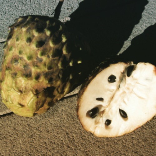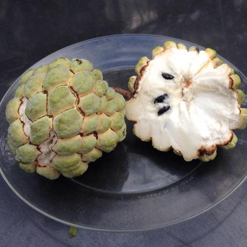 Sugar-apple fruits are segmented, shaped almost like a hand grenade. They have a creamy white flesh surrounding numerous black seeds. The flavor of sugar-apple is variable from tree to tree, but the best have a melting sweet flavor.
