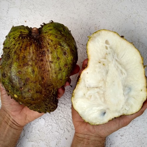 Guanabana, or soursop, is a large fruit in the annona group. It is especially popular for juicing. Guanabana juice is a popular drink in many Latin American countries. The flavor has elements of pineapple, and also reminds me a bit of apple juice. Some varieties of guanabana have a fibrous texture, which are best used for juice, while other types are fiberless and are better suited to eating out of hand. Soursop is very cold sensitive. It grows and fruits only in the warmest parts of South Florida.